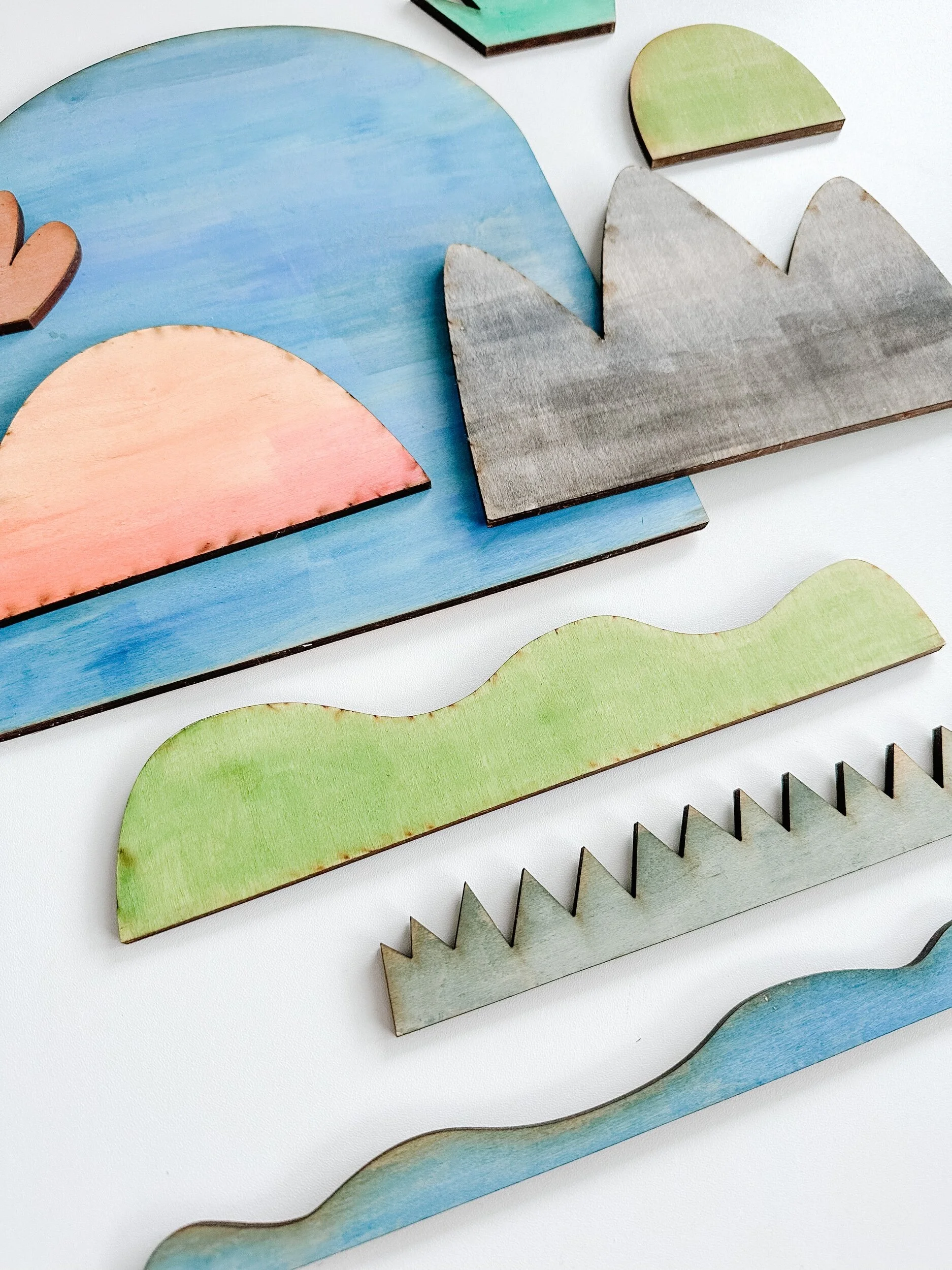 The largest piece is our background and one side is a day sky (as pictured) and the other side is a dusk sky (imagine orange, reds and a hint of the dark night) . Not pictured in the base which is green on one side and blue on the other for grass/water.