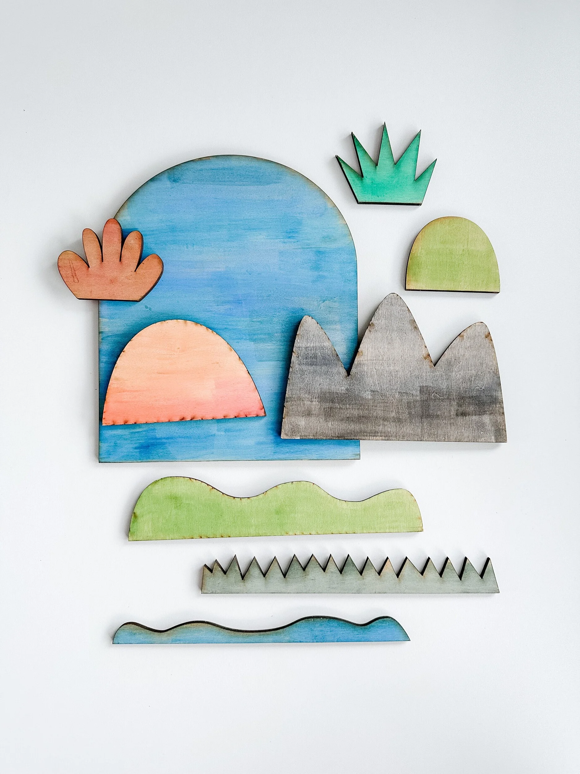 This pack includes nine, wooden, hand painted pieces that are double sided creating double the play possibilities.